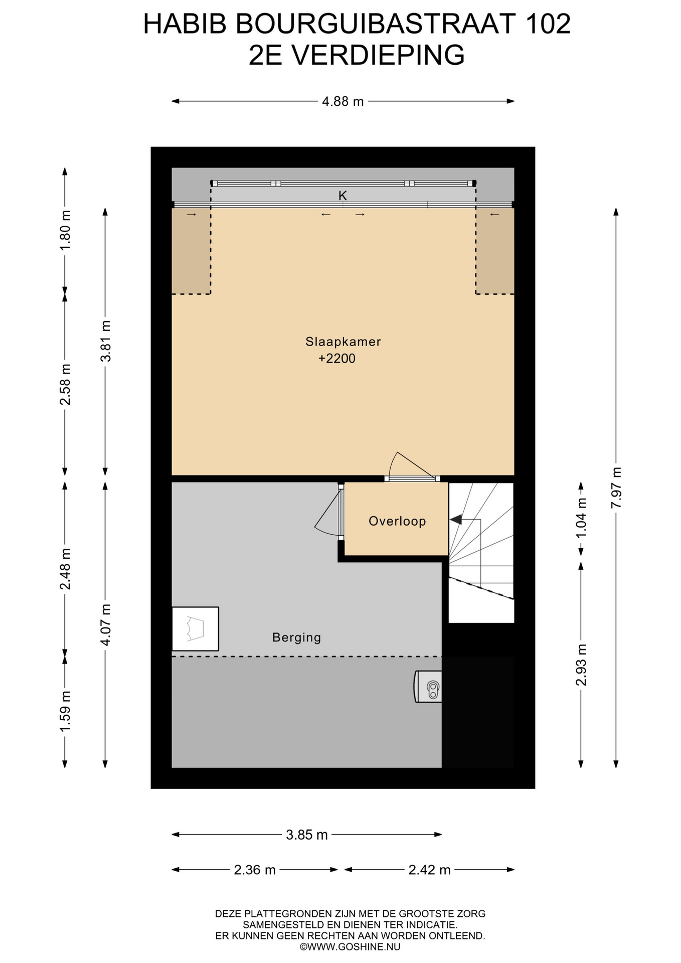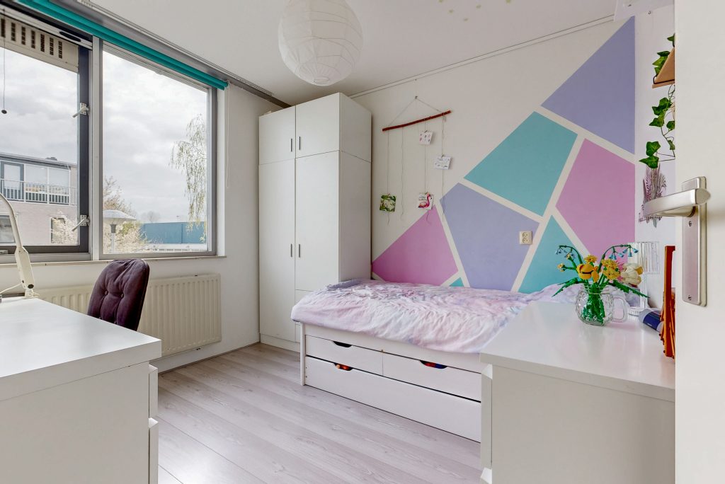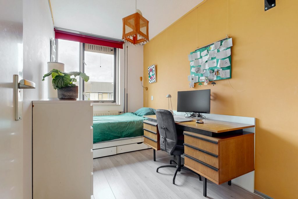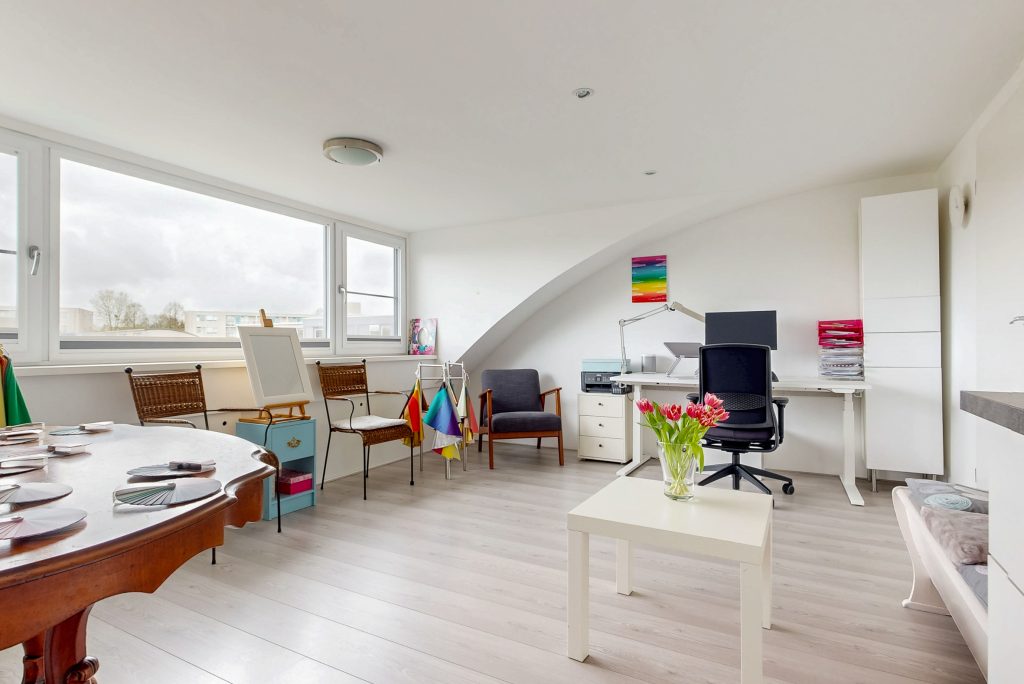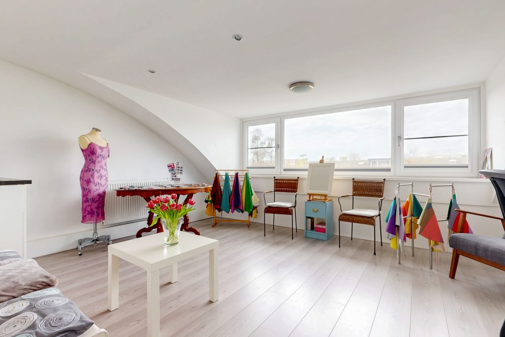 De zolder is een waardevolle toevoeging aan de woning. Hier bevinden zich twee aparte ruimtes. Aan de achterkant: een ruime kamer waarin door de grote dakkapel veel daglicht naar binnen stroomt. Dit en de ronde vormen van het dak naast de dakkapel geven de ruimte een lichte en speelse sfeer. Als je vanuit deze grote kamer naar buiten kijkt, heb je wijds uitzicht op groene tuinen, voetbalvelden en zelfs de dom. Deze kamer is, mede door het keukenblok, multifunctioneel en leent zich goed voor een werkruimte, een extra slaapkamer of een hobbyruimte.