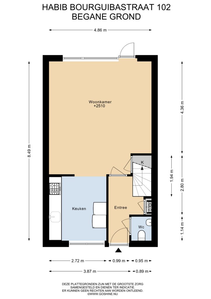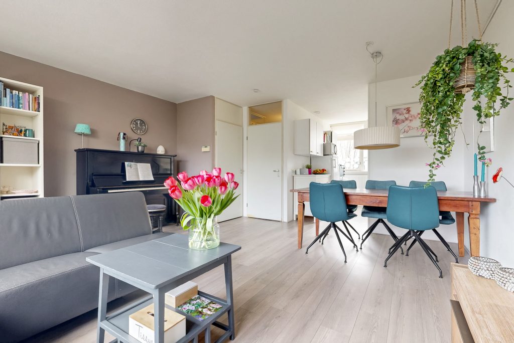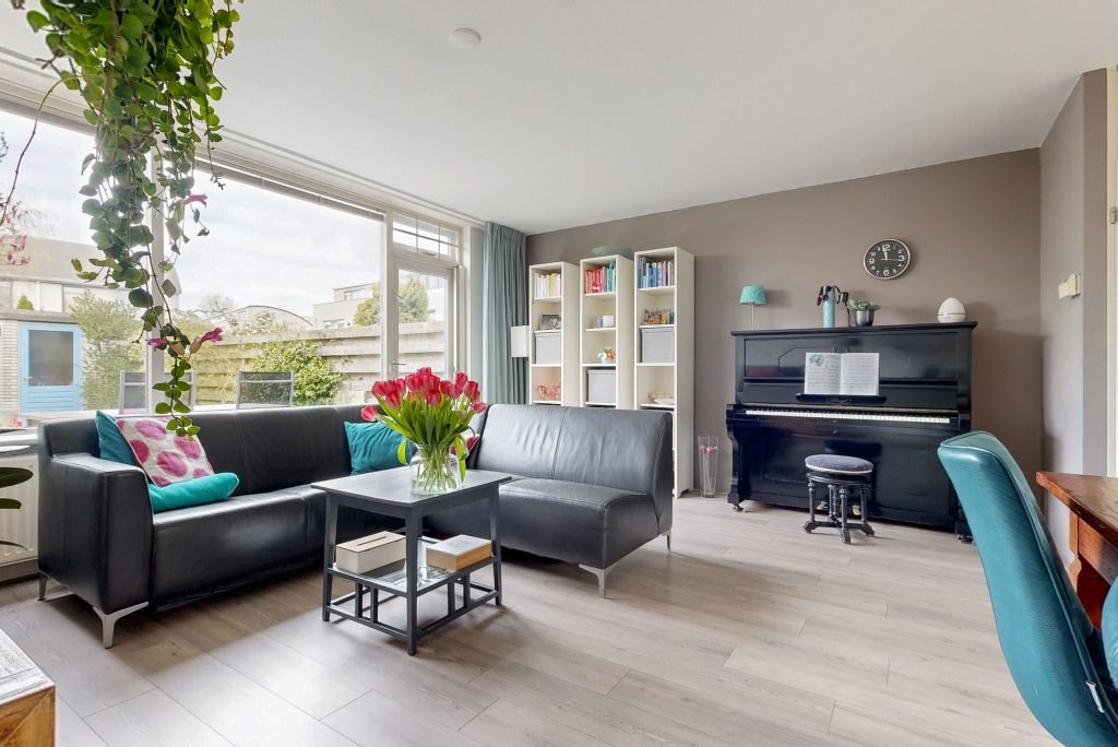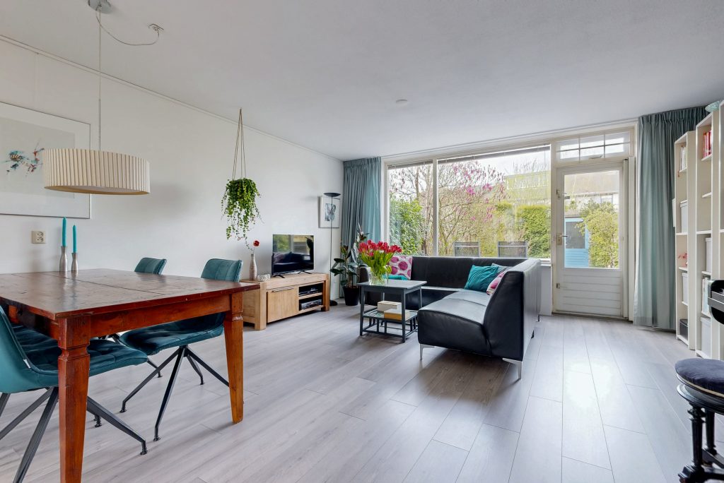 Je komt binnen in de entree, waar zich de meterkast en het toilet bevinden. Vanuit de hal loop je door naar de woonkamer met fraai uitzicht op de tuin door het grote raam. De ruimte is licht en biedt plaats voor onder meer een comfortabele zithoek en eettafel.