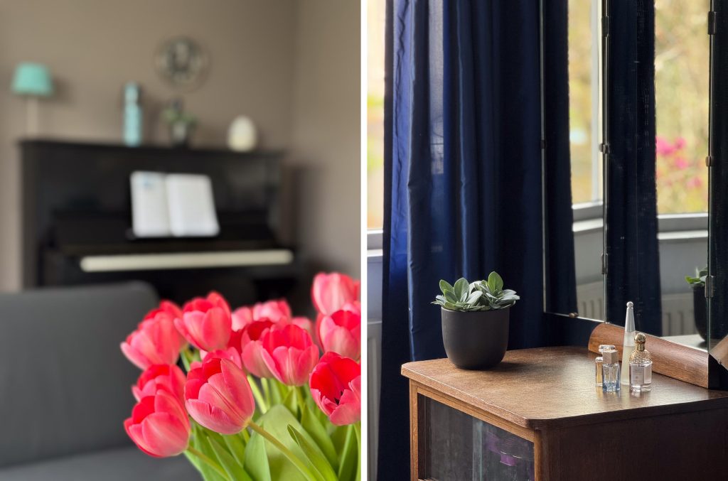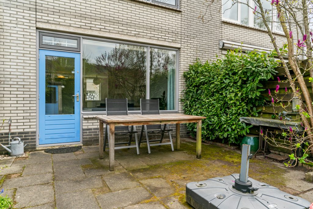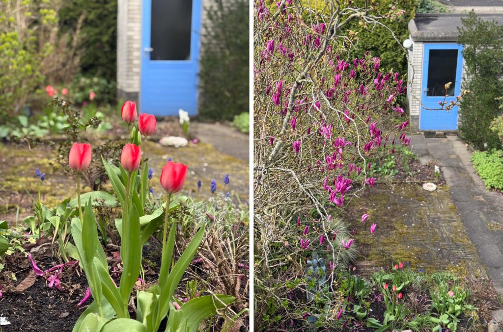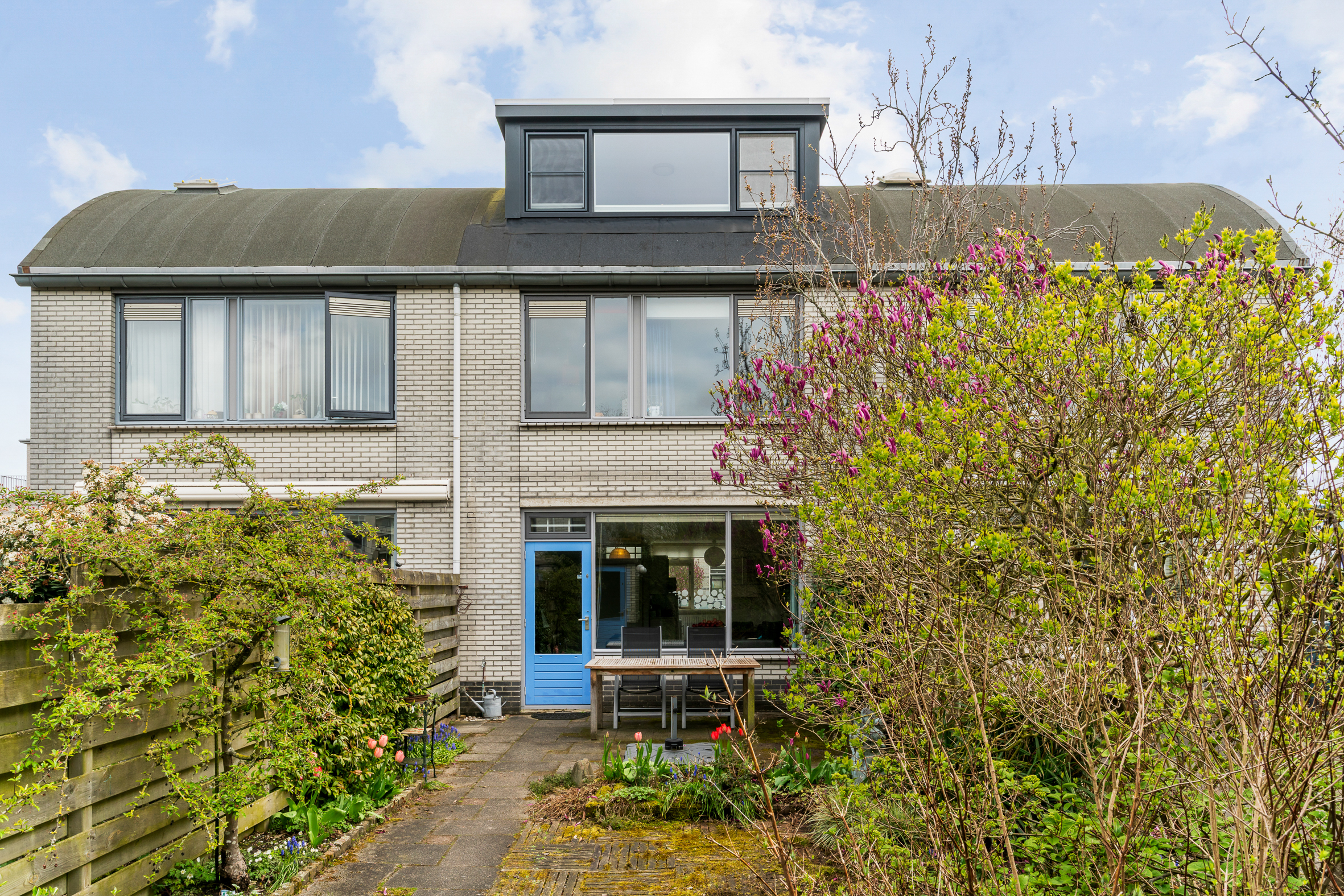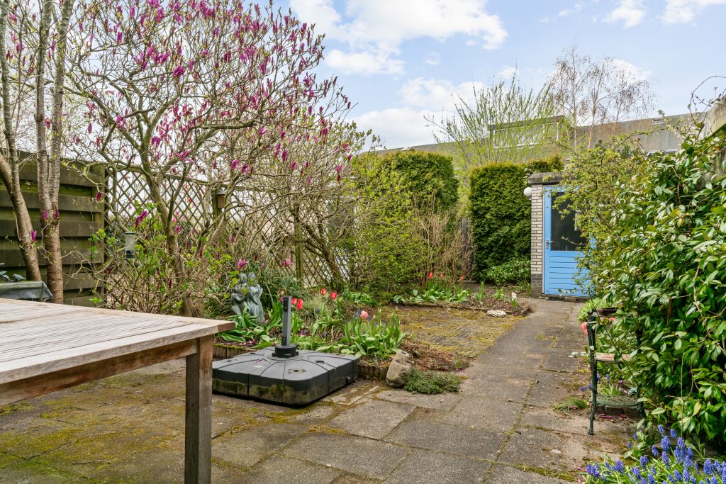 In het voorjaar bloeien onder meer de tulpen, de magnolia en de heerlijk geurende sering. Later in het jaar geniet je onder andere van de hortensia, de lavendel en jasmijn. Een kleur- en geurrijke tuin dus. Ook de voortuin draagt bij aan de sfeer met bijvoorbeeld de prachtige bloesem van de sierkers.