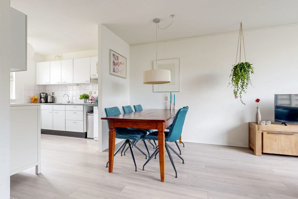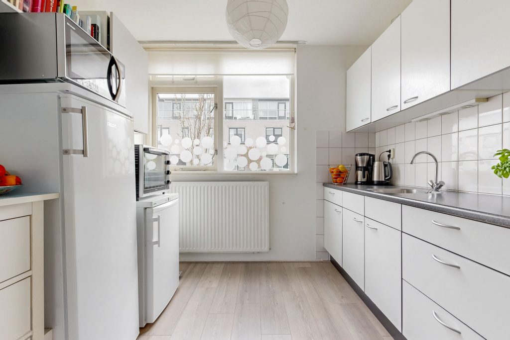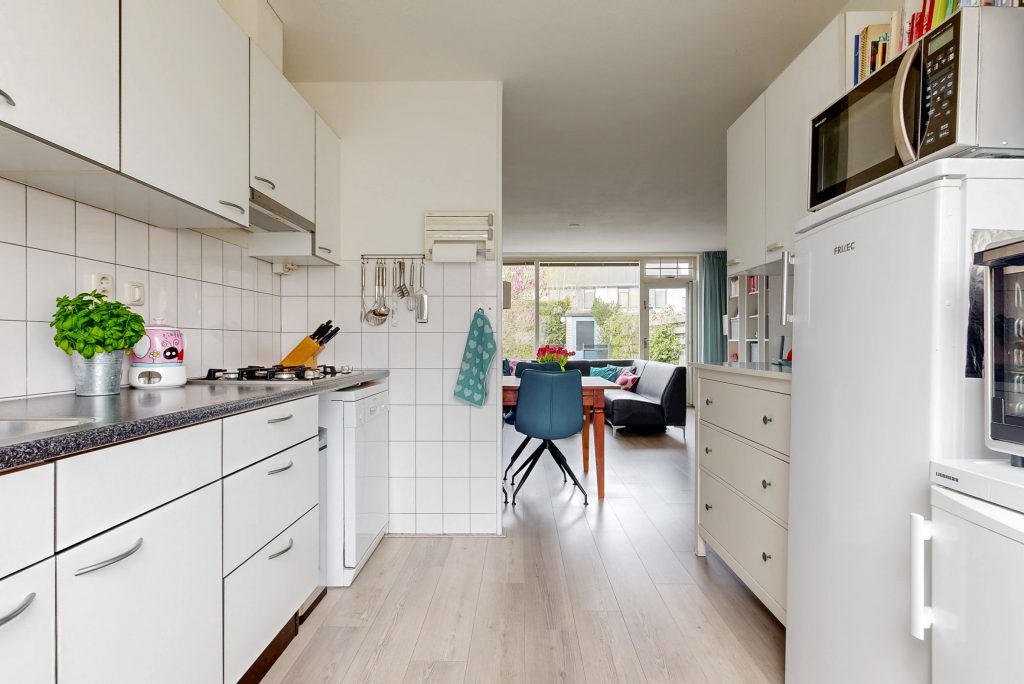 Aan de voorzijde van de woning ligt de keuken. Deze is voorzien van alle benodigde apparatuur en kijkt uit op de voortuin en rustige straat. De opstelling is praktisch en sluit goed aan bij het dagelijks gebruik.