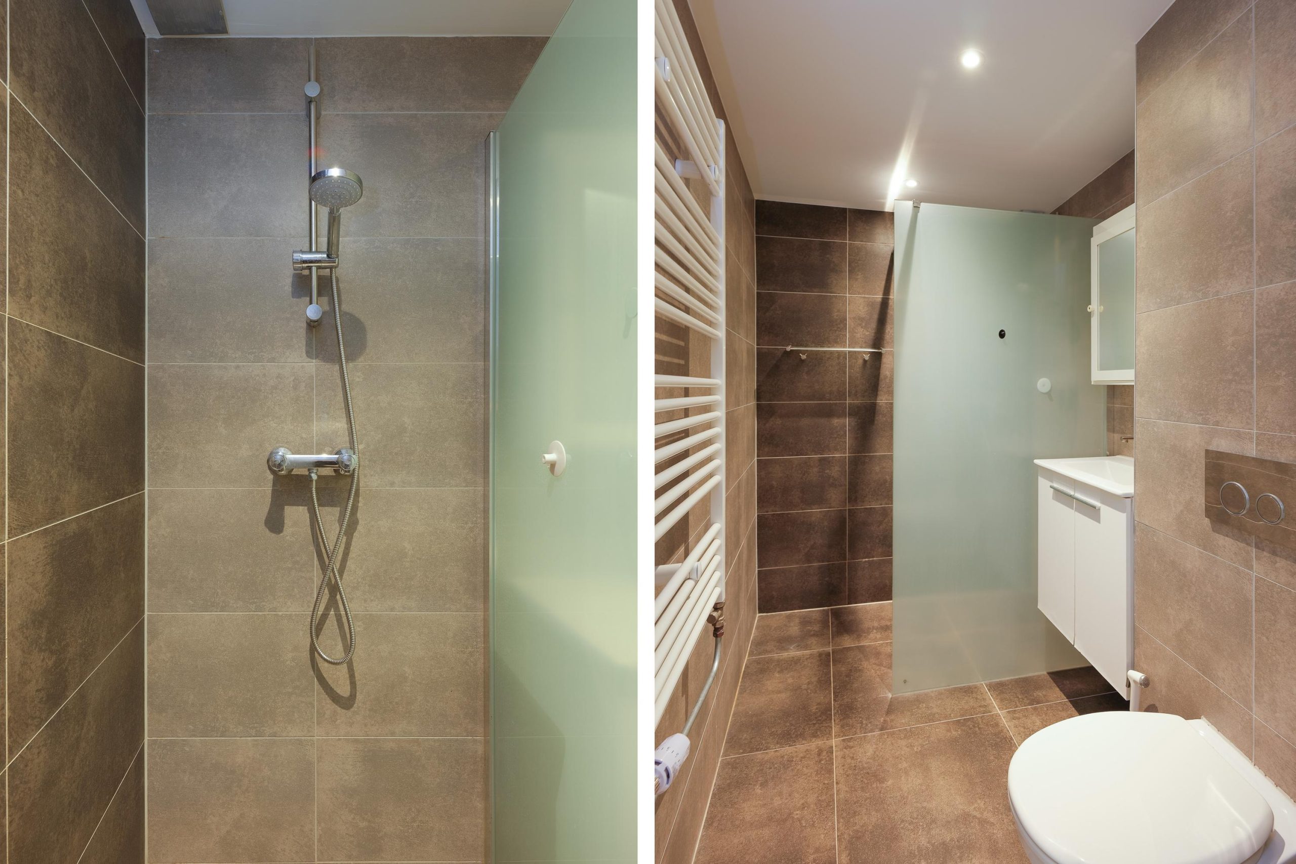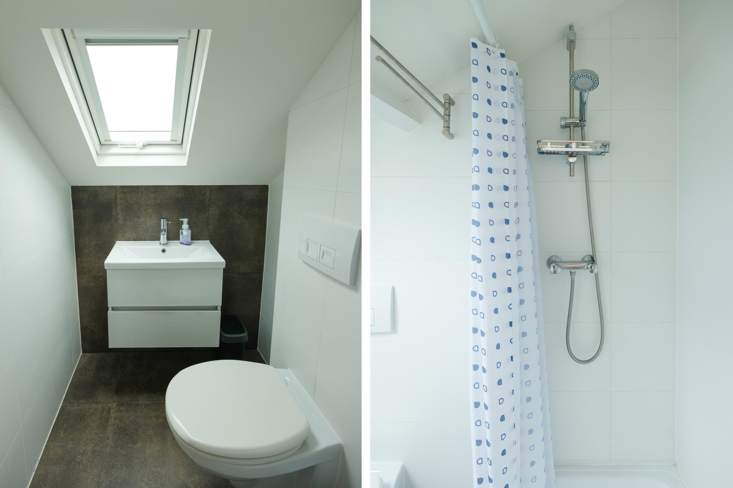 Ook de eerste badkamer is op deze verdieping te vinden. Deze moderne badkamer is voorzien van fraai tegelwerk, een inloopdouche, hangend toilet en een net badkamermeubel met wastafel.