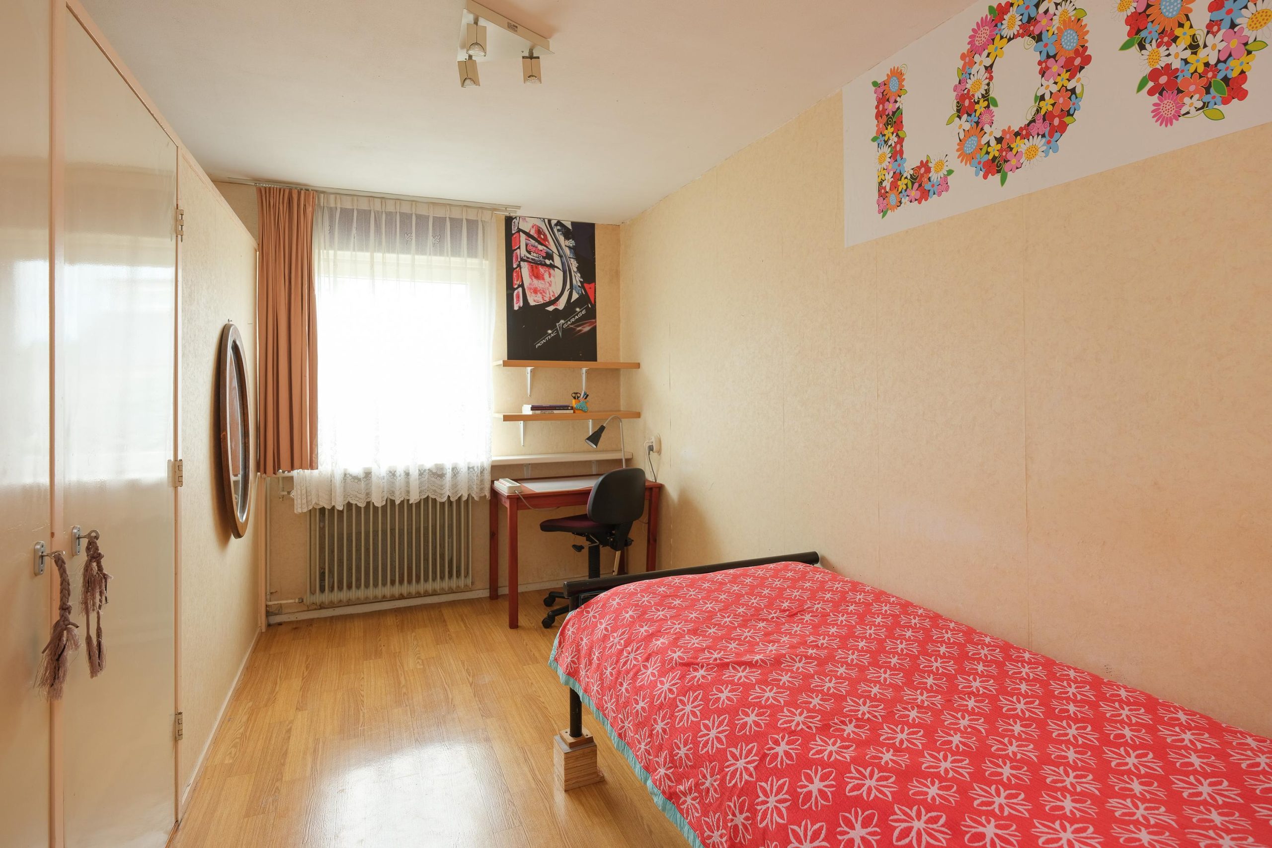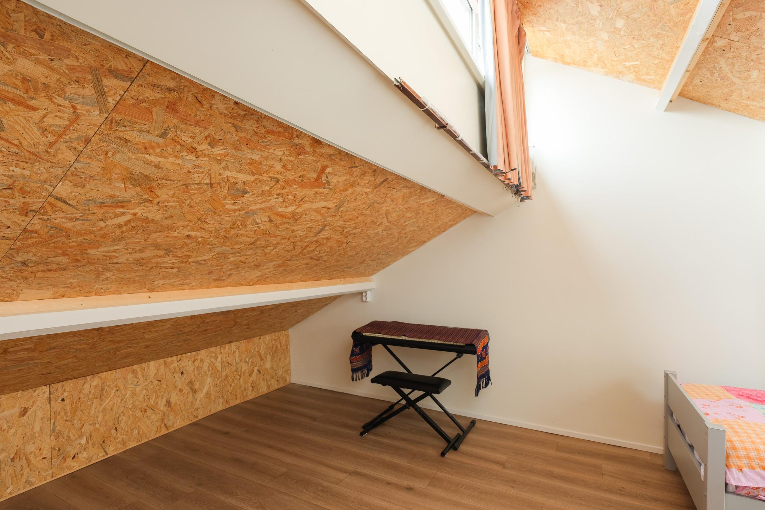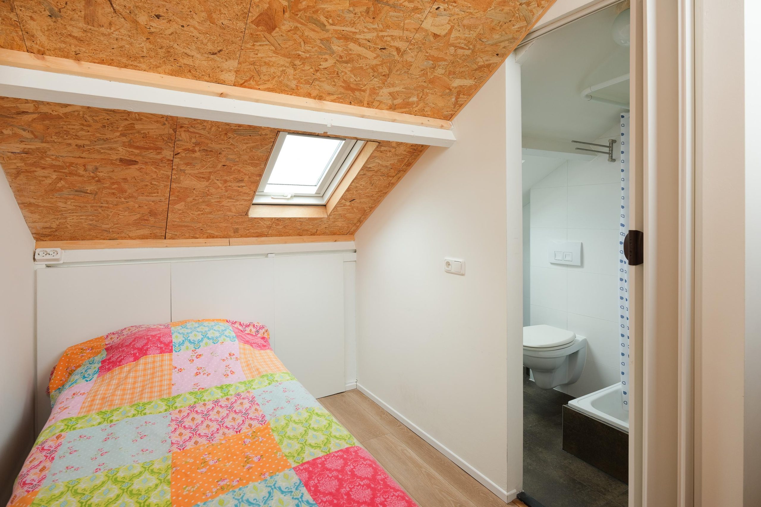 Met de vaste trap vanaf de eerste verdieping kom je op de overloop van de tweede verdieping. Op de deze verdieping is een ruime slaapkamer te vinden met daarnaast de moderne tweede badkamer. Deze badkamer is voorzien van inloopdouche, hangend toilet en een badkamermeubel met wastafel.