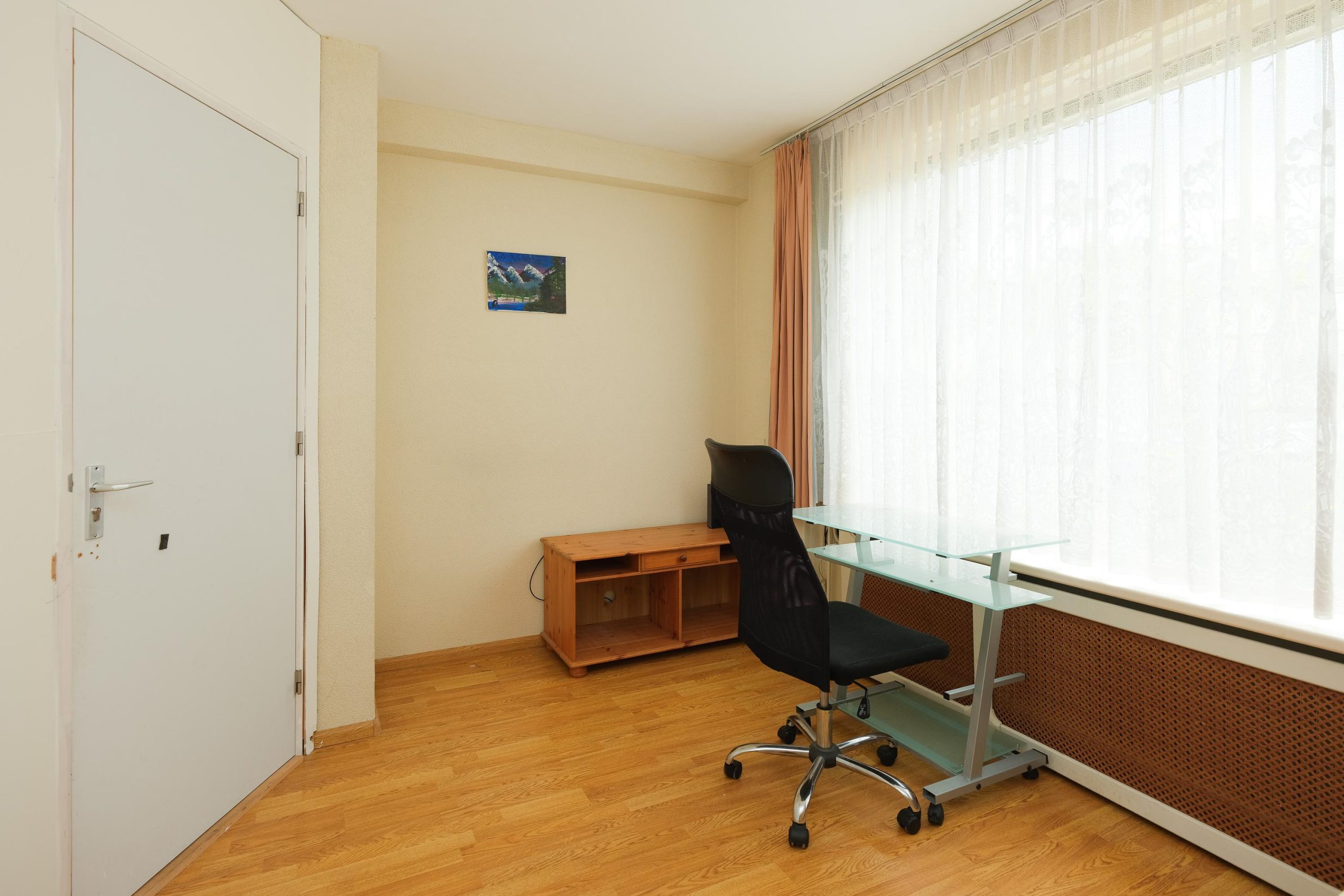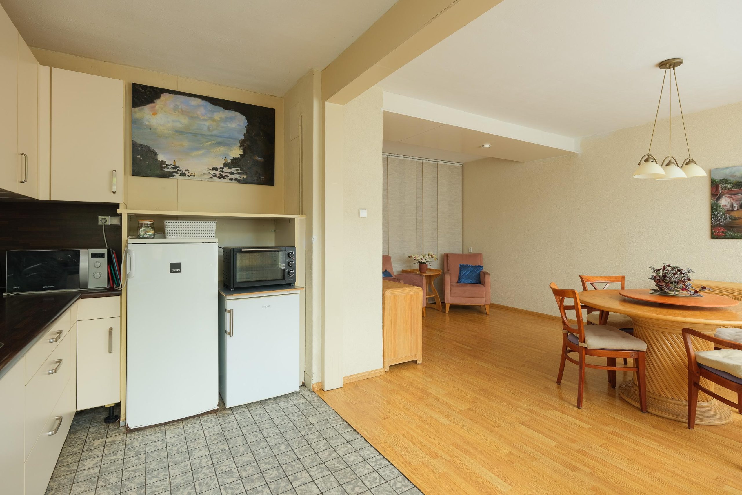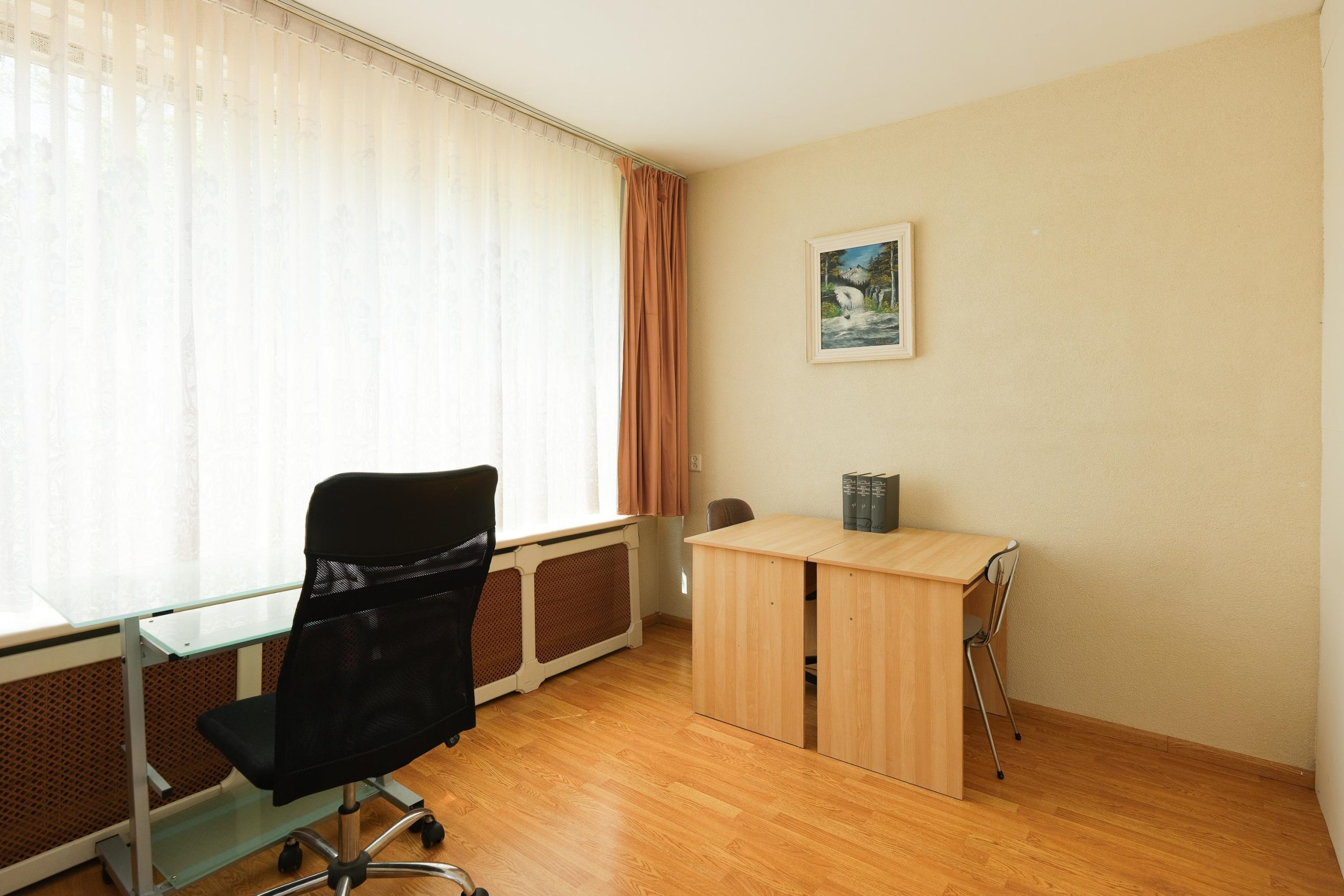 Vanuit de hal loop je door de ruime en lichte woonkamer binnen. Aan de voorzijde bevindt zich een aparte afgesloten ruimte die nu in gebruik is als werkkamer. Deze kamer is doormiddel van het verwijderen van de tussenwand weer gemakkelijk bij de woonkamer te trekken.