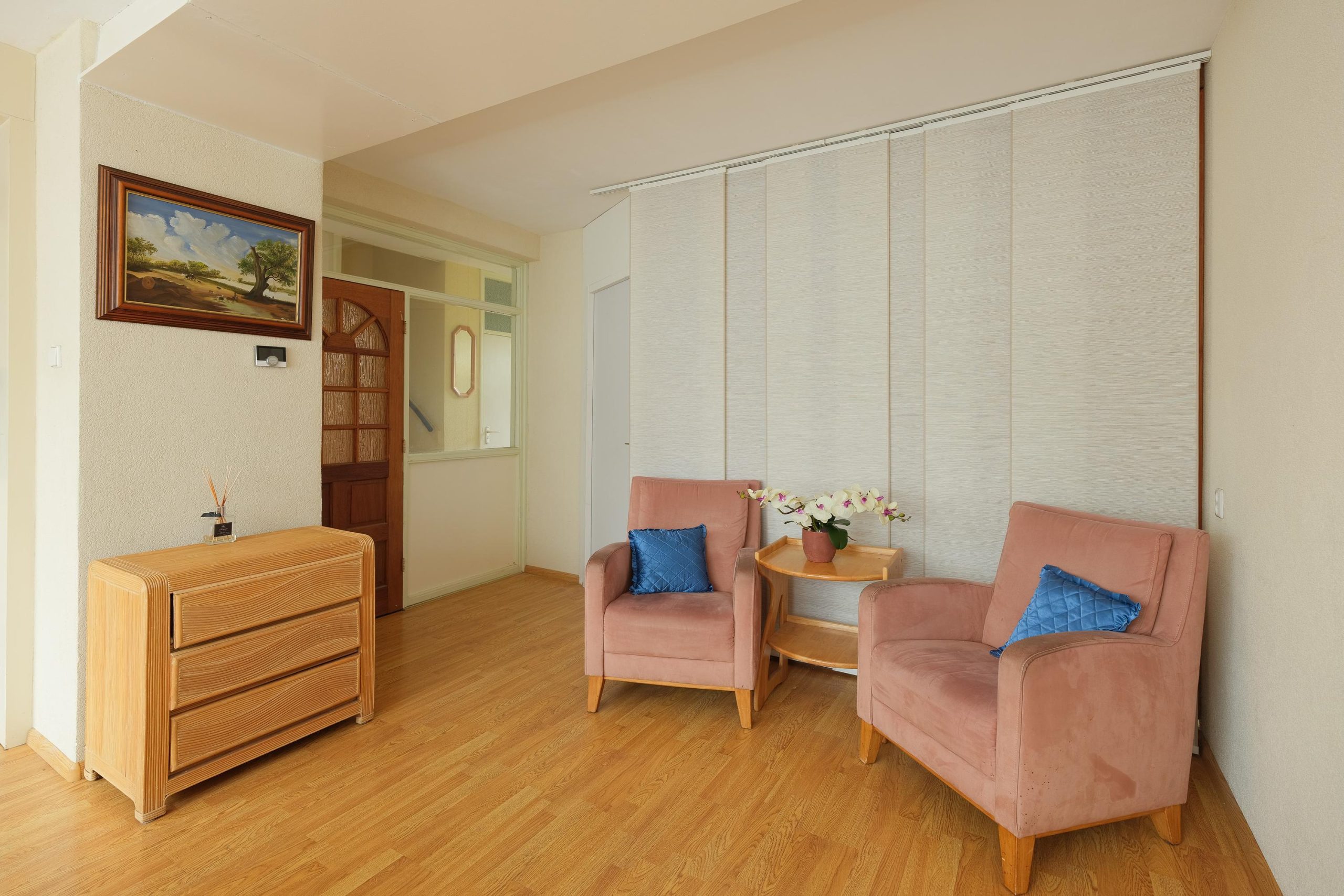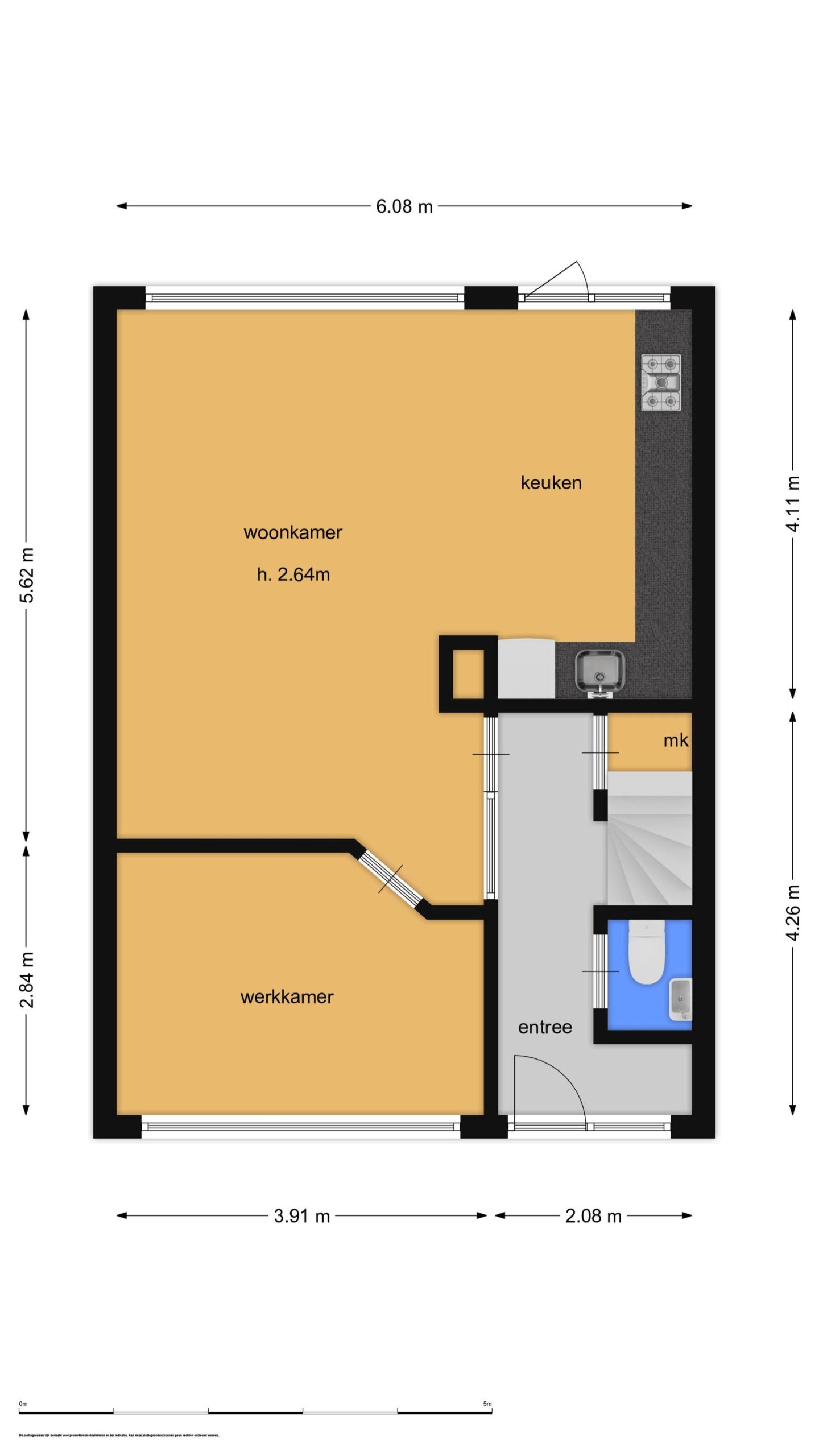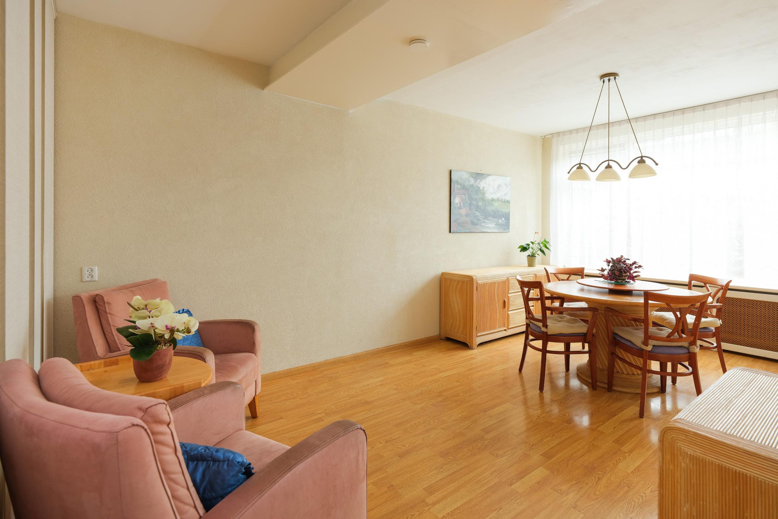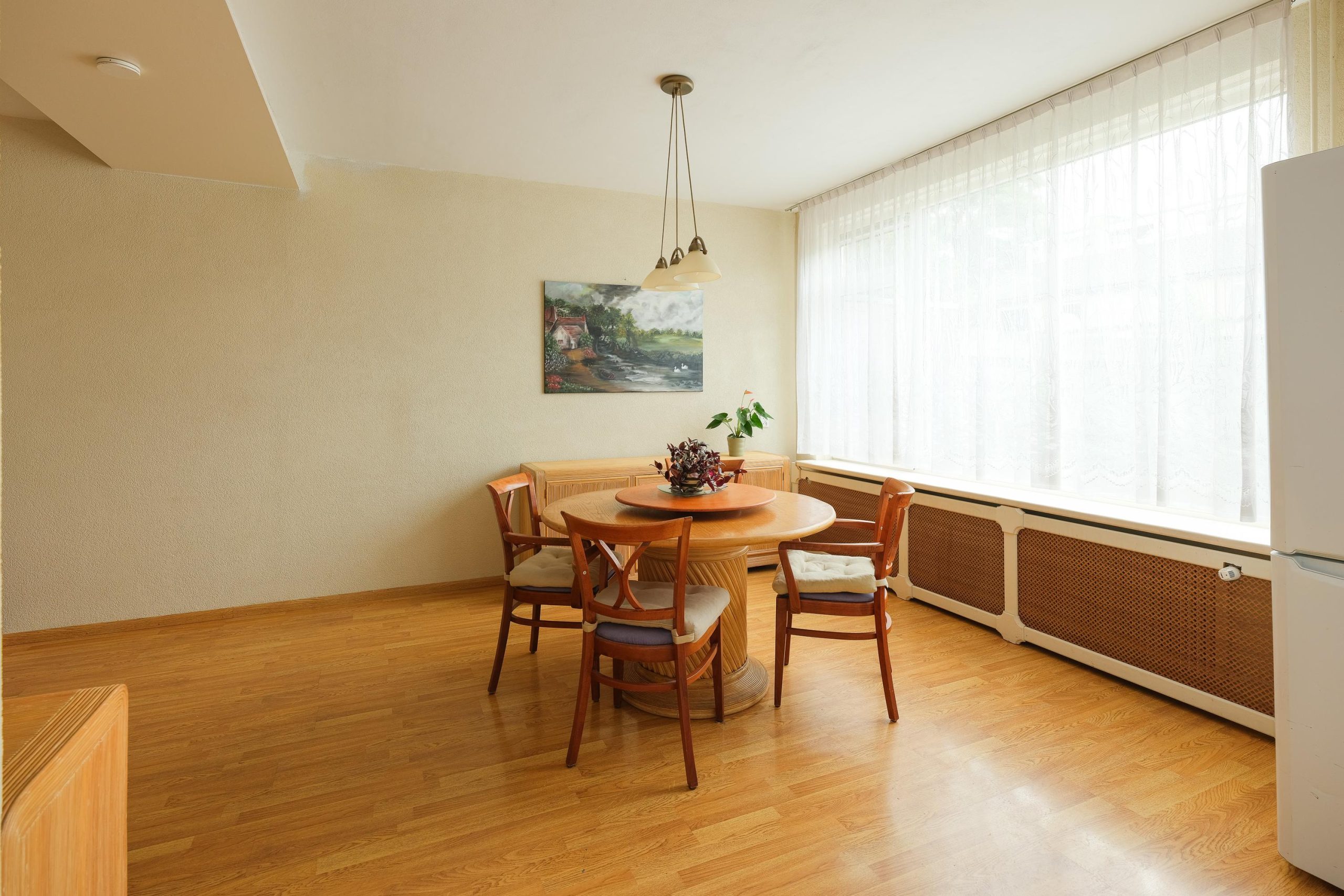 Vanuit de hal loop je door de ruime en lichte woonkamer binnen. Aan de voorzijde bevindt zich een aparte afgesloten ruimte die nu in gebruik is als werkkamer. Deze kamer is doormiddel van het verwijderen van de tussenwand weer gemakkelijk bij de woonkamer te trekken.