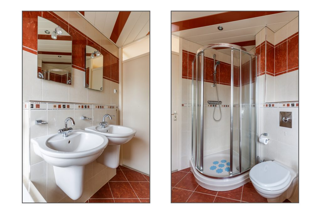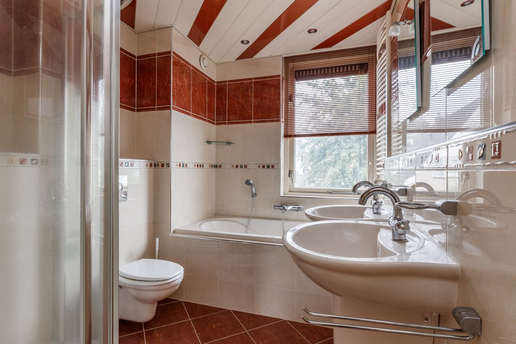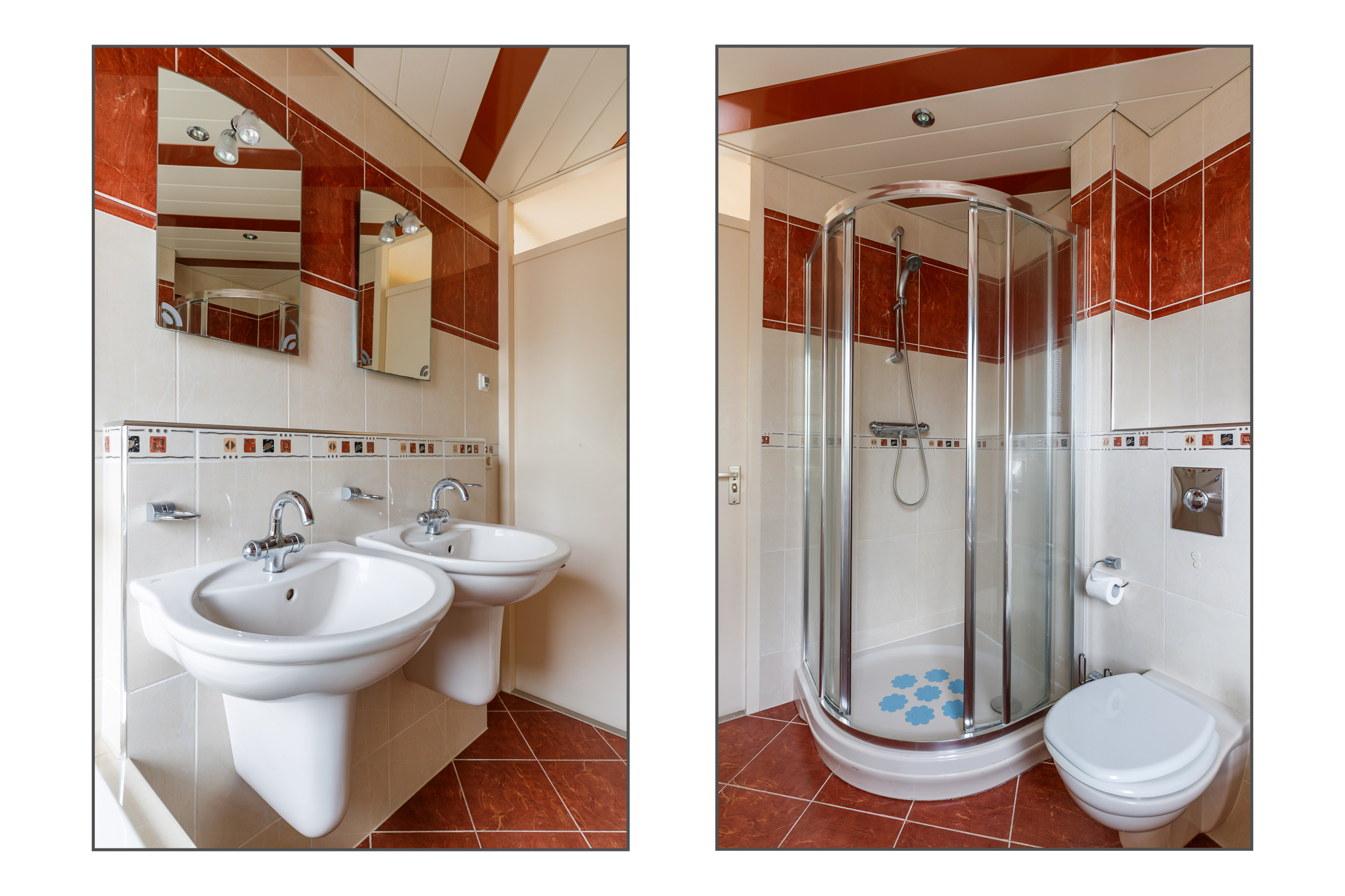 Op de eerste etage bevinden zich drie slaapkamers, elk met hun eigen screens voor een aangenaam binnenklimaat. De badkamer is royaal en voorzien van een douchecabine, bubbelbad, dubbele wastafel, toilet én – jawel – ook hier weer vloerverwarming.