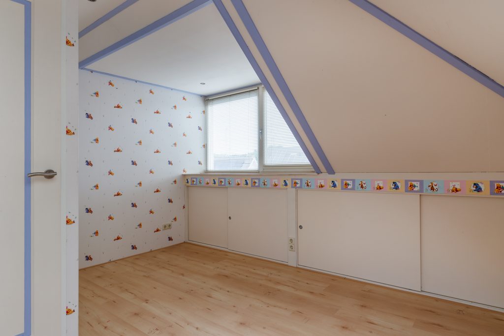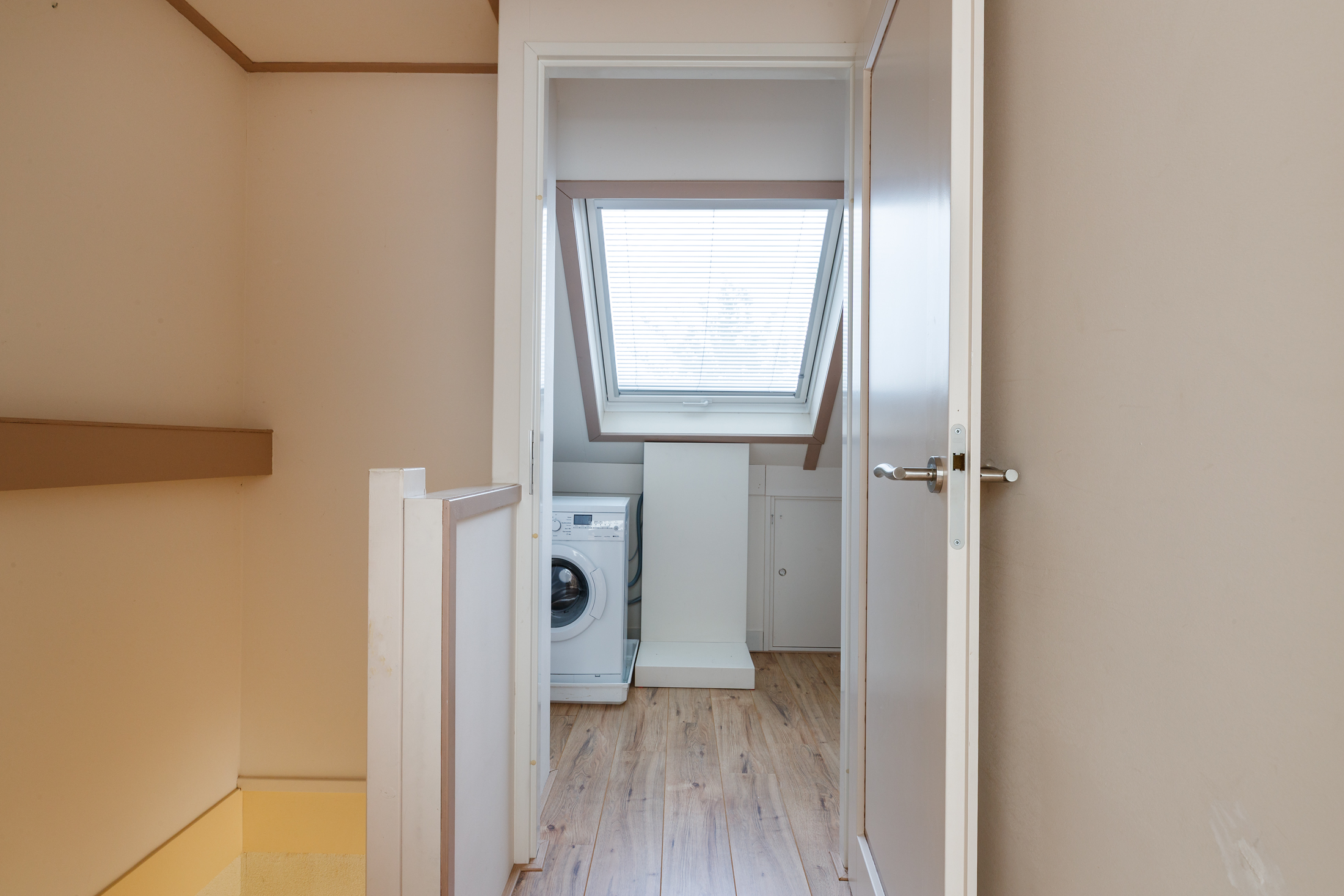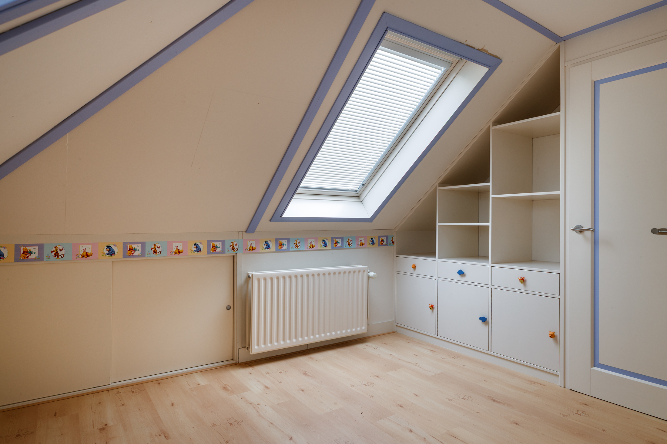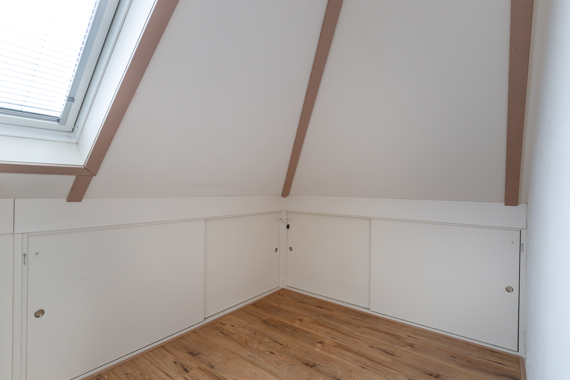 Op de tweede verdieping tref je een tweetal ruimtes. Een ruime waskamer met CV-opstelling, mechanische ventilatie en volop bergruimte. Daarnaast is er nog een grote vierde slaapkamer met veel licht, knieschotten rondom voor extra opslag en een kastenwand Ideaal als werkplek, extra slaapkamer of hobbyruimte. Er is zelfs nog een kleine vliering bovenin.